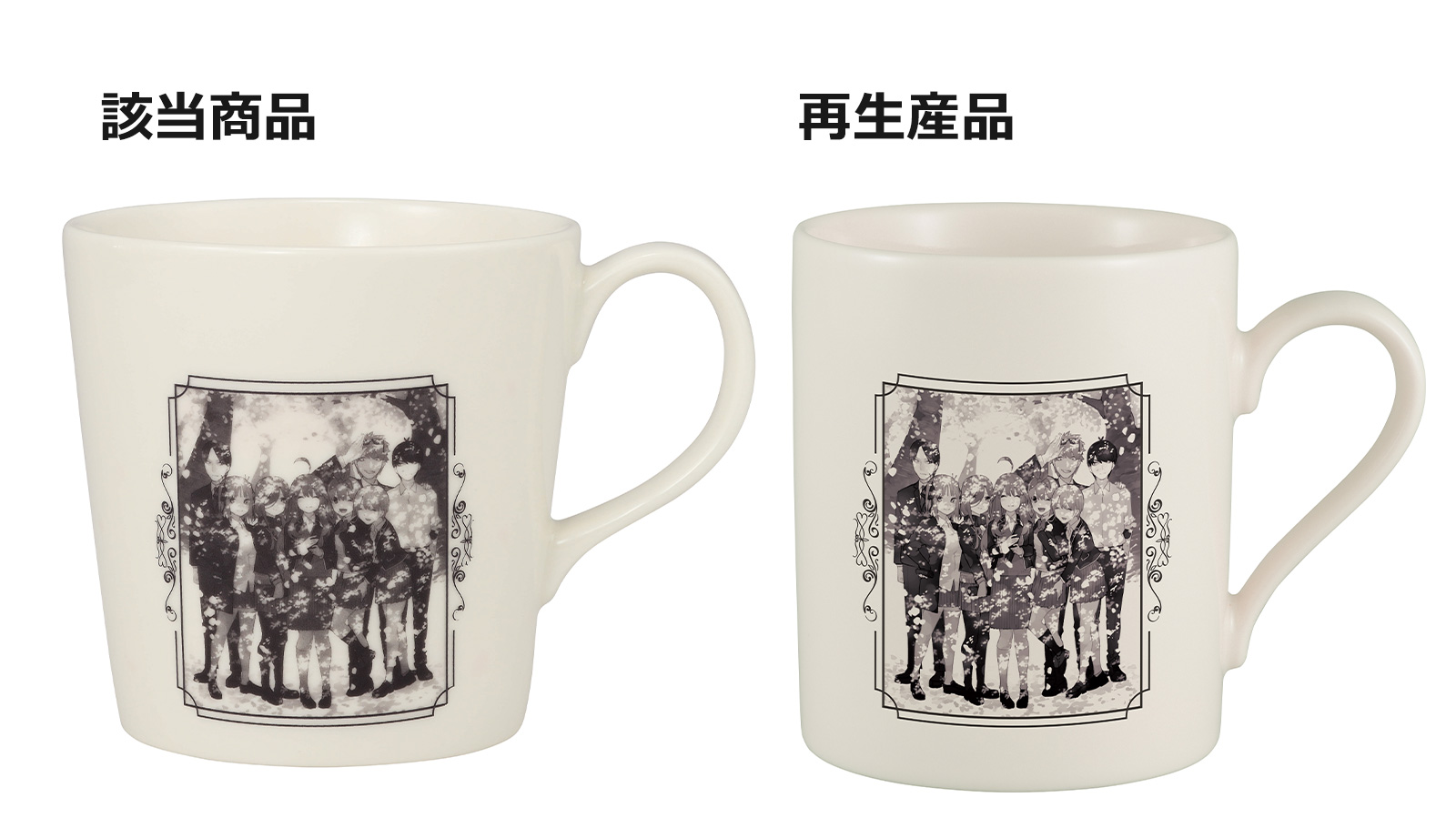 この度「一番くじ 五等分の花嫁 ~一番くじ化5周年のお祝いも私たち全員で分かち合います!~」G賞 「想い出のマグカップ」おきまして、お湯を注ぐとマグカップの外側の絵柄が一部剥がれてしまう事象が発生いたしました。