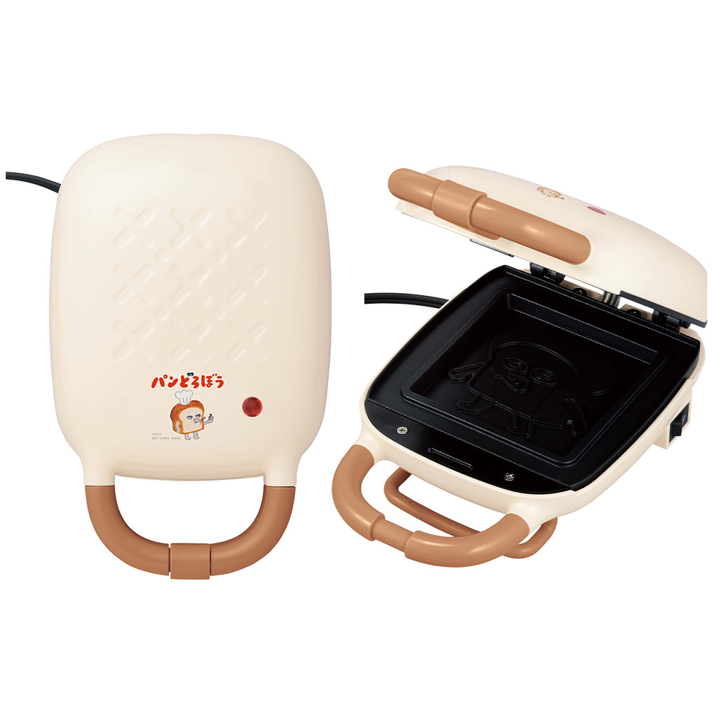 おうちで簡単にホットサンドが作れちゃう、AC電源タイプの「ホットサンドマシーン」です。 ホットサンドが焼きあがると、表面にはパンどろぼうが現れるよ♪ 裏面のデザインは焼きあがってからのお楽しみ…!! ※大人の方と一緒に使用してください。