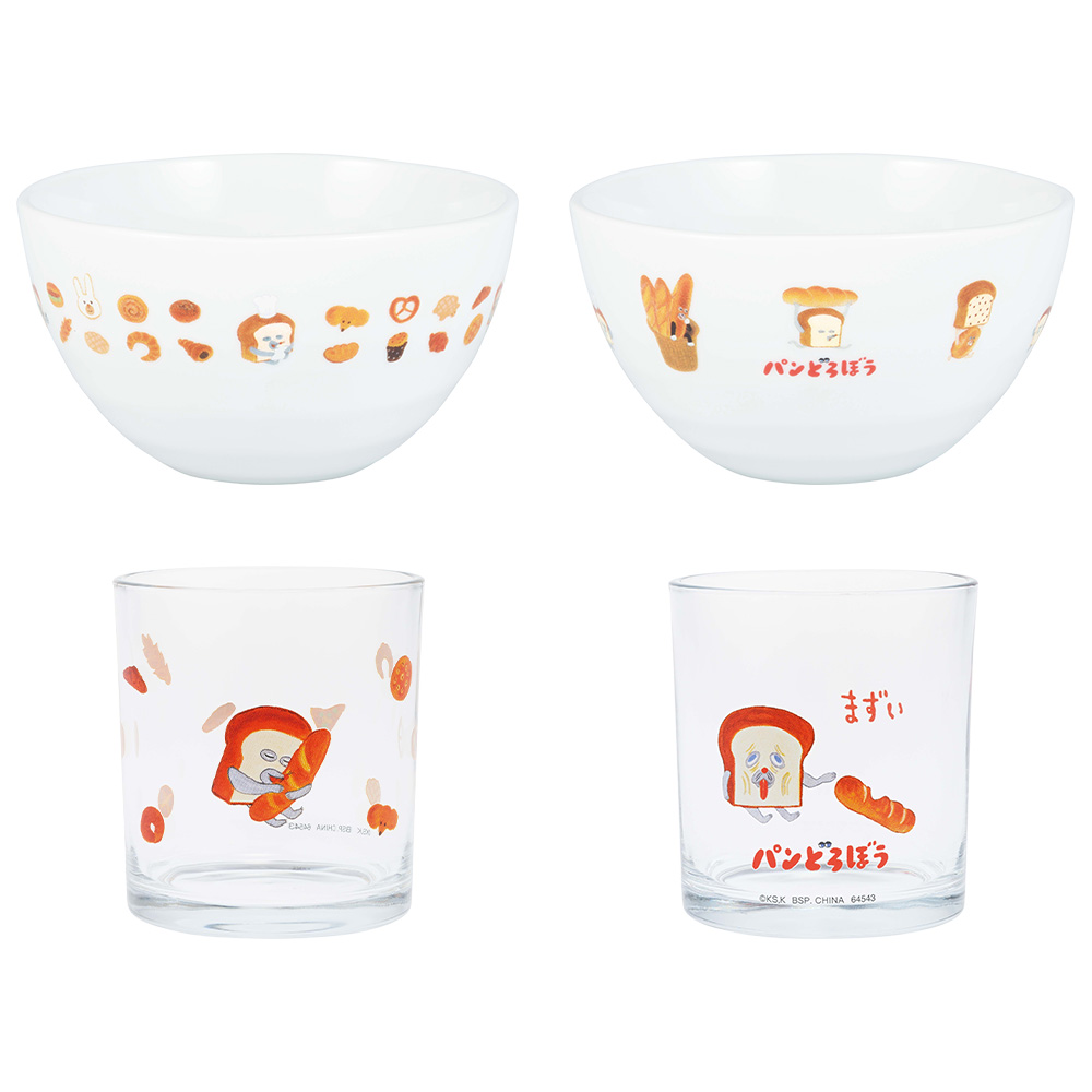 選べる全4種のスープボウル・グラスアソートです。 パンどろぼうの仲間たちや、おいしそうなパンのイラストがたくさんデザインされています。 スープボウルは、サラダやフルーツの盛り付けなどマルチに使えるよ♪