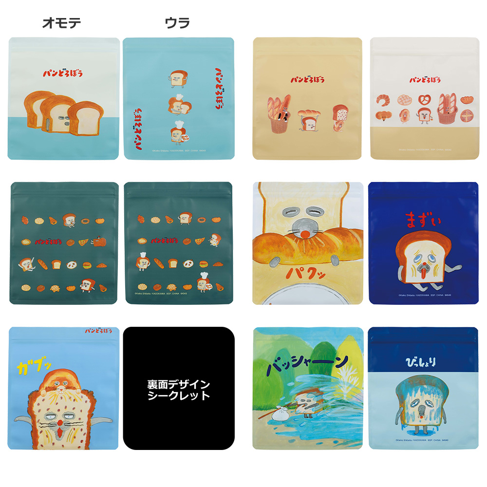 選べる全6種のジッパーバッグ(1種5枚入り)です。 表裏異なるデザインでパンどろぼうの世界観をたくさん楽しめます!